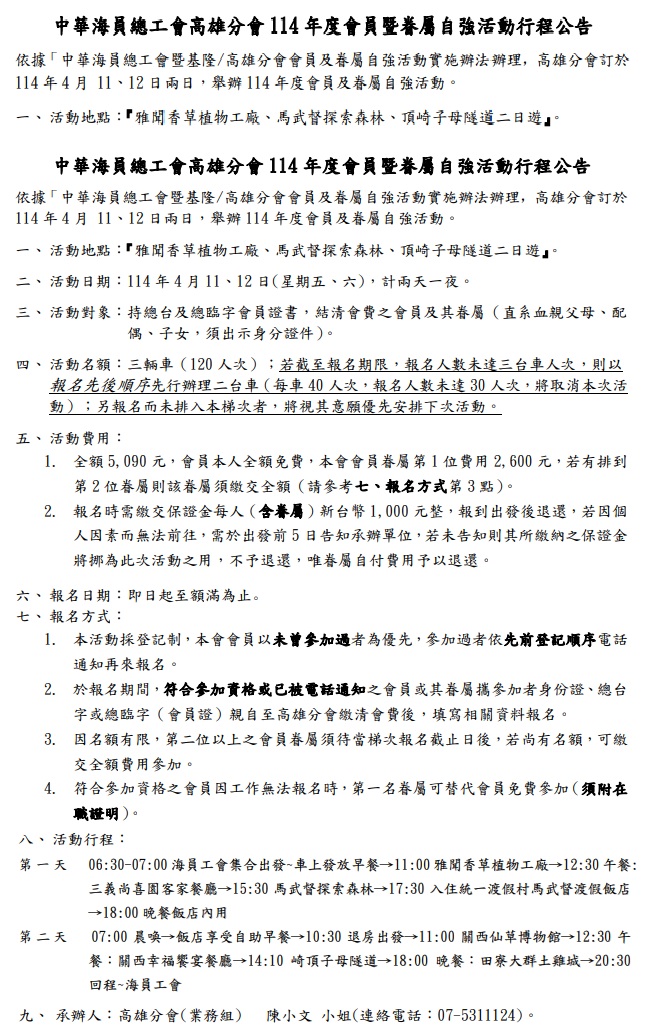 中華海員總工會高雄分會114年度會員暨眷屬自強活動公告(114年4月11~12日)