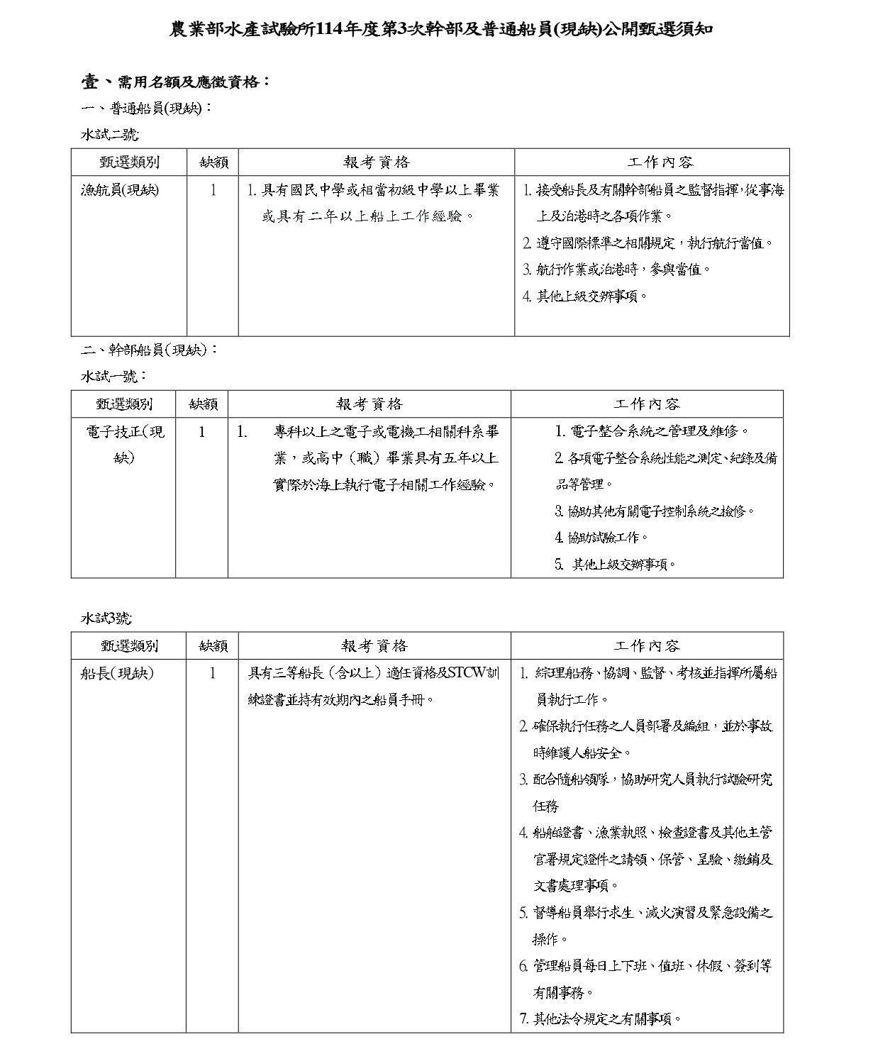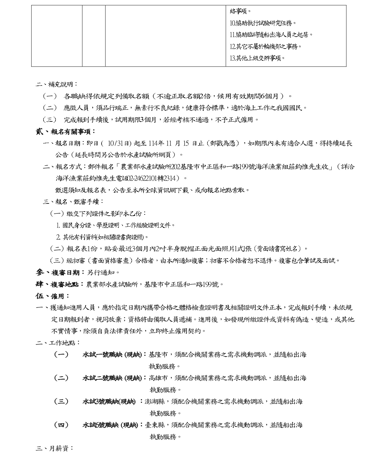 二、報名方式:郵件報名「農業部水產試驗所202基隆市中正區和一路199號海洋漁業組莊鈞惟先生收」(詳洽海洋漁業莊鈞惟先生電話02-246221012314