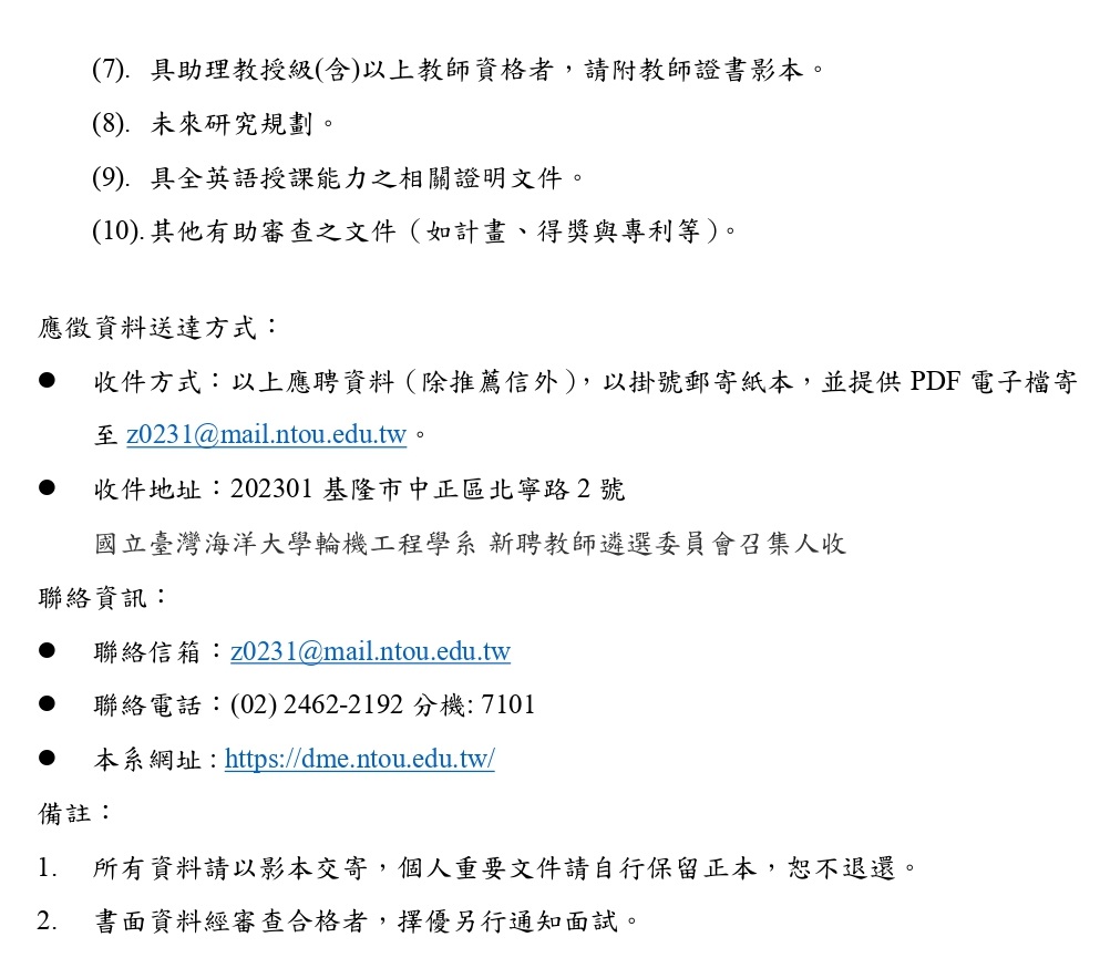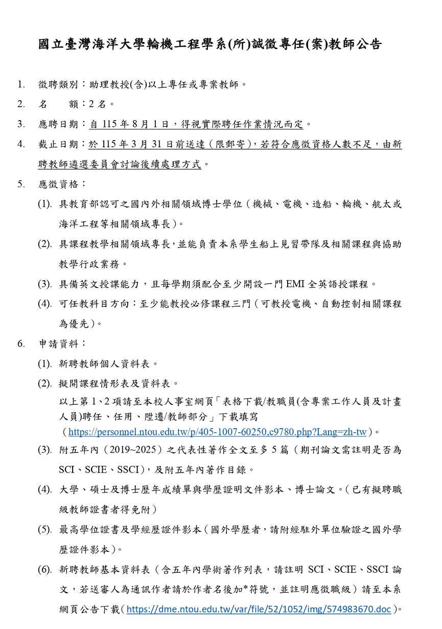 國立臺灣海洋大學輪機工程學系誠徵專任教師公告