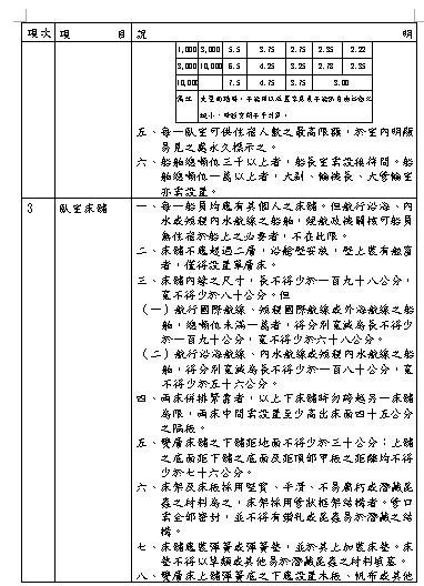 第 四 條 本規則所稱名詞之定義如下: 一、貨船:指以載運貨物為主要目的之非客船。 二、易燃液體船:指供載運大量散裝原油與石油產品之貨船,其原油與石油產品之閉杯法試驗閃點,以核定之閃點試驗設備試驗結果未超過攝氏六十度,其瑞德揮發氣壓低於大氣壓者。或供裝載其他液體產品具有同等火災危險之貨船。 三、瑞德揮發氣壓:指於密閉之容器內儲置體積比為一比四之液體樣品及空氣,當溫度準確保持於攝氏三十七點八度或華氏一百度時之氣壓即為該液體之一個瑞德揮發氣壓。 四、渡船:指在國內一定口岸間以銜接陸上交通,逐日或隔日按班次作定期往返航行之客船。 五、漁船:指經營漁業、漁業巡護、漁業試驗、漁業訓練之船舶。但娛樂漁業漁船,不在此限。 六、水產加工船:指設有水產生物加工設備之船舶。 七、核子船舶:指裝有核子動力裝置之船舶。 八、特種用途船:指依國際海事組織「一九八三年特種用途船舶安全國際章程」及其後續版本設計、建造之船舶。 九、全船人數:指航政機關核定全部在船人數。 第一百四十六條 本規則所稱居住設備,指下列設備及其屬具: 一、膳宿設備。 二、通風設備。 三、空調設備。 四、照明設備。 五、衛生設備。 六、醫藥設備。 七、其他居住設備。 第一百四十七條 受船舶所有人僱用經常服務於船上之船員居住設備,適用本編規定。但中華民國一百零二年八月二十日前已安放龍骨或建造已達類似安放龍骨階段之船舶,不適用本編第一百四十八條、第一百五十三條至第一百五十七條、第一百六十條、第一百六十四條及第一百六十六條規定,另依附件八規定。供客船乘客用之居住設備,適用客船管理規則規定。非供客船乘客用之居住設備,準用客船管理規則規定。第一百四十八條 下列船舶之船員居住設備,本編規定未能適用時,得經航政機關或驗船機構視該船性質酌准寬減或豁免之: 一、總噸位未滿二百之動力船舶。 二、非動力船舶。 三、非航行國際航線或短程國際航線之拖船。 四、具有特殊設計、構造、型式、用途或性能之船舶。 五、船員無需住宿於船上之船舶。 下列船舶不適用船員居住設備之規定: 一、航行於內水航線、短程內水航線、遮蔽水域或適用港區範圍水域之船舶。 二、帆船。 三、漁船。 第一百五十三條 臥室之位置及構造,應符合下列規定: 一、不得設於船艏避碰艙壁之前,或直接設於工作通道之下。 二、頂部甲板不得低於最深載重線。但客船及特種用途船舶具有優良之通風及照明經航政機關或驗船機構認可者,不在此限。 三、臥室與貨艙、機器間、廚房、油燈室、油漆室、儲存室、乾燥室、公共浴廁等間,不得有直接相通之門戶。 四、臥室外部之艙壁及與前款規定各艙室間之隔艙均以鋼材或其他經核准之材料建造,並保持水密。 第一百五十四條 臥室之分配及地面面積,應符合下列規定:一、臥室以各部門分開為原則。但經航政機關或驗船機構認可,得酌准寬免。二、日間工作船員應與值更船員分室而居。三、臥室之住宿人數,除經航政機關或驗船機構認可外,其分配原則如下:(一)航行國際航線或短程國際航線之船舶,除客船及特種用途船外,應為每一船員提供單獨臥室。但船舶總噸位未滿三千或非航行國際航線或短程國際航線者,得甲級船員一人一室,其他船員一人或二人一室。(二)客船之甲級船員一人或二人一室,其他船員不得超過四人一室。(三)特種用途船之甲級船員一人或二人一室,其他船員得超過四人一室。四、臥室之地面面積應符合附件五規定。五、每一臥室可供住宿人數之最高限額,於室內明顯易見之處永久標示之。六、船舶總噸位三千以上者,應為船長、大副及輪機長設置與臥室相連之接待間。船舶總噸位一萬以上者,大管輪室亦需設置。七、應為男女船員提供分開之臥室。 第一百五十五條 臥室床舖應符合下列規定:一、每一船員均應有其個人之床舖。但航行沿海航線之船舶,經航政機關或驗船機構認可船員無住宿於船上之必要者,不在此限。二、床舖不應超過二層,沿艙壁安放,壁上裝有舷窗者,僅得設置單層床。三、床舖內緣之尺寸,長不得少於一百九十八公分,寬不得少於八十公分。四、兩床併排緊靠者,以上下床舖時勿跨越另一床舖為限,兩床中間需設置至少高出床面四十五公分之隔板。五、雙層床舖之下舖距地面不得少於三十公分;上舖之底面距下舖之底面及距頂部甲板之距離均不得少於七十六公分。六、床架及床板採用堅實、平滑、不易腐朽或潛藏昆蟲之材料為之,床架採用管狀框架結構者。管口需全部密封,並不得有鑽孔或昆蟲易於潛藏之結構。七、床舖應裝彈簧或彈簧墊,並於其上加裝床墊。床墊不得以草類或其他易於潛藏昆蟲之材料填塞。八、雙層床上舖彈簧底之下應設置木板、帆布或其他適當材料製之底墊以防塵。 第一百五十六條 臥室之裝飾及家具,應符合下列規定:一、每人備有金屬或其他堅實、光滑材料構造之衣櫃一個,置於易於接近使用之處,其容積至少為四百七十五公升,櫃內並應裝設隔架,隔架內佈置應便於儲放衣物,櫃外並應裝設鎖扣。二、每人備有容積至少五十六公升之抽屜或相等之空間。但抽屜與衣櫃為一體者,合計容積至少應為五百公升。三、臥室內設置固定式或摺疊式之桌及必需之舒適坐椅,所有桌椅等