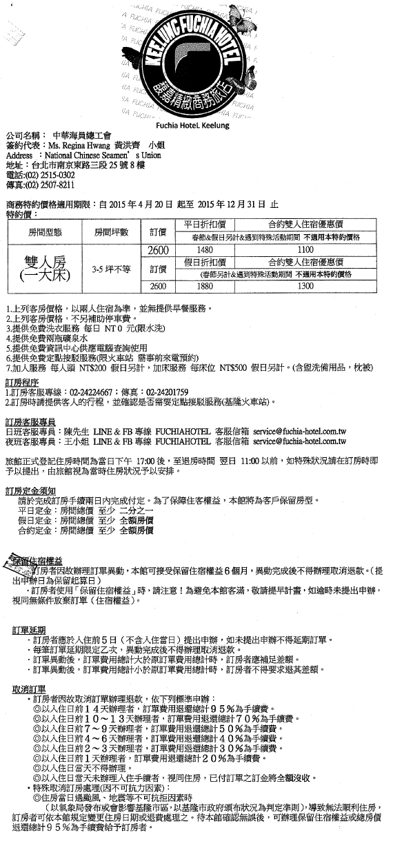 最新消息總覽>公告內容 發佈日期:2015-04-28 03:04:19   發佈單位:中華海員總工會