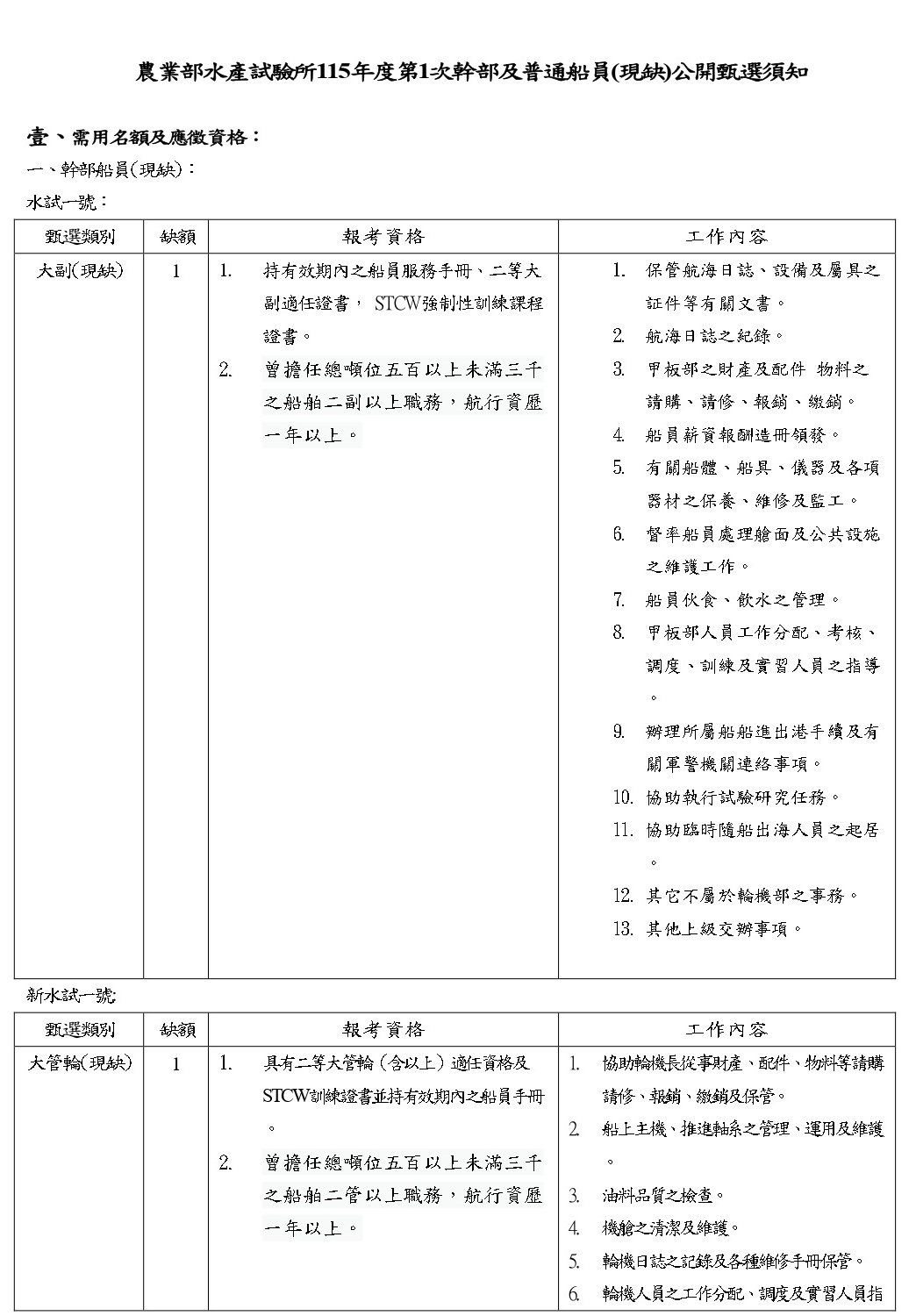 115年度第1次幹部及普通船員(現缺)公開甄選須知
