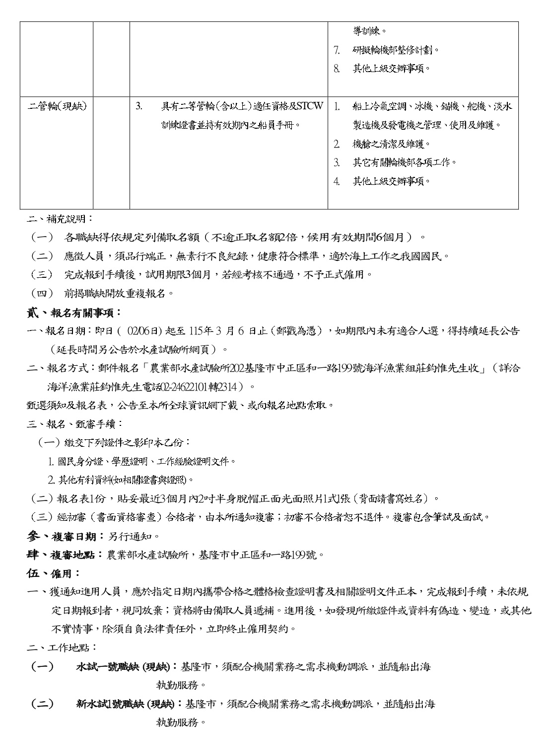 一、報名日期:即日 (  02/06起至 115 3  6 日止(郵戳為憑),如期限內未有適合人選,得持續延長公告(延長時間另公告於水產試驗所網頁)。